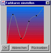 Im Normalfall ist die eingezeichnete Linie eine Gerade aus der linken unteren in die rechte obere Ecke. An den schwarzen Rechtecken kann die Kurve bewegt werden. Es werden kubische Splines zur interpolierung der Kruve verwendet. Die Darstellung ist so zu interpretieren, daß auf der Horizontalen der Messwert eingetragen ist. In der Vertikalen wird dann durch die Spline der Farbwert, der diesem Meßwert zugeordnet wird, bestimmt.