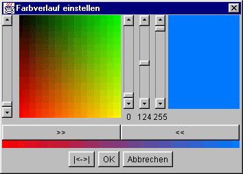 Bei der Auswahl mit einem Color-Picker wird in den farbigen Feld der Rot- und Grün-Anteil festgelegt. Mit dem Regler kann dann der Blauanteil verändert werden. In die Auswahl mit drei Reglern gelant man mit dem Button ">>". Dort wird über drei Regler der Anteil für Rot, Grün und Blau in der angegebenen Reihenfolge aus einem Bereich von 0 bis 255 ausgewählt.