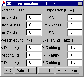 In diesem Dialog werden die Transformationen eingetellt, die bei der 3D-Anzeige durchgeführt werden. Die Transformationen werden in der Reihenfolge: Rotation, Verschiebung, Skalierung ausgeführt.