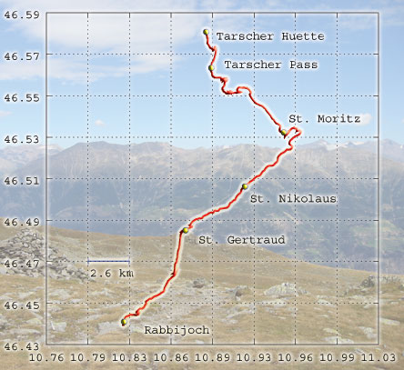 Weiter ging es hinunter ins Tal nach St. Gertraud auf 1200m und von da aus wieder hoch zum Rabbijoch. Der Schotterauffahrt folgte wieder einmal eine Tragepassage der letzten Höhenmeter.